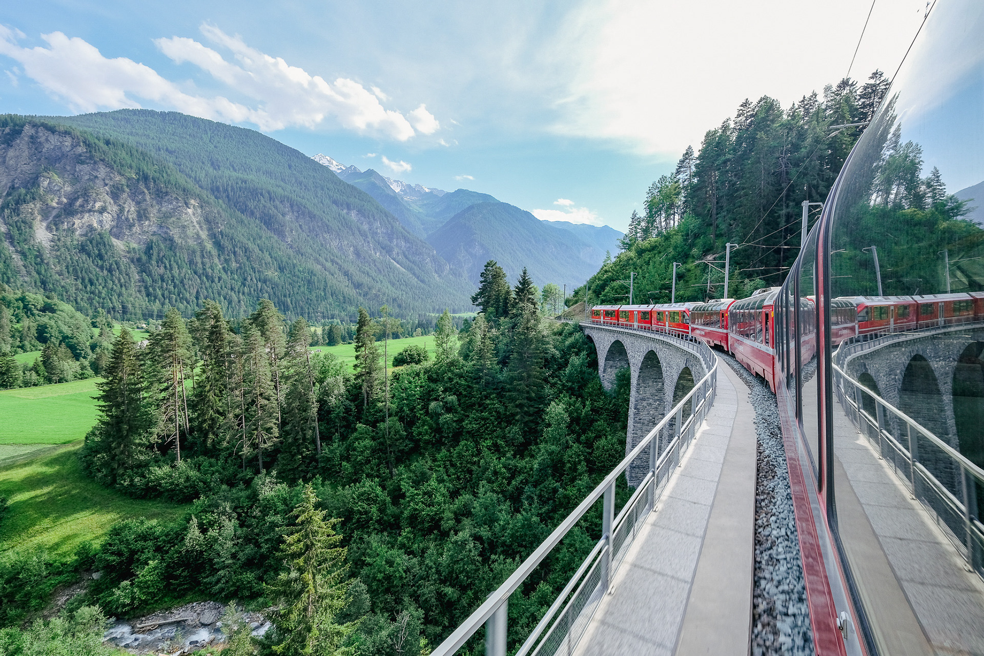 "Experience the splendor of the Swiss Alps aboard the Bernina Express, a UNESCO World Heritage Site celebrated for its breathtaking views. Capture the one of the world's most beautiful train routes, highlighting stunning landscapes."